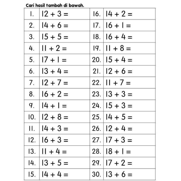 Operasi Tambah 11 20 Worksheet